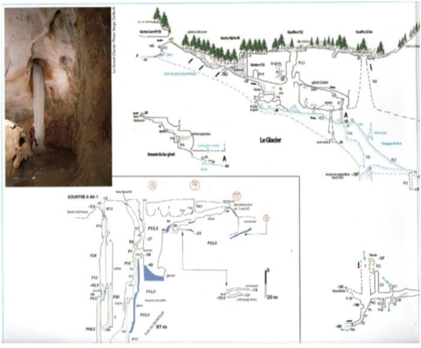 Près de l’entrée, une partie entièrement englacée transformait la spéléologie en randonnée glaciare sur plus de 250 mètres. C’est cette particularité qui lui a donné ce nom de Grand Glacier.
